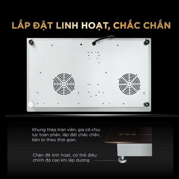 Đặc biệt bếp được thiết kế hiện đại với 2 kiểu lắp đặt: lắp âm sang trọng hoặc lắp dương tiện dụng. Trong trường hợp lắp dương, chân đế của bếp có thể điều chỉnh độ cao linh hoạt, phù hợp với nhiều không gian bếp khác nhau. Thiết kế này mang đến sự linh hoạt tối đa, giúp sản phẩm trở thành lựa chọn lý tưởng cho cả căn bếp mới xây dựng lẫn bếp cần cải tạo.
