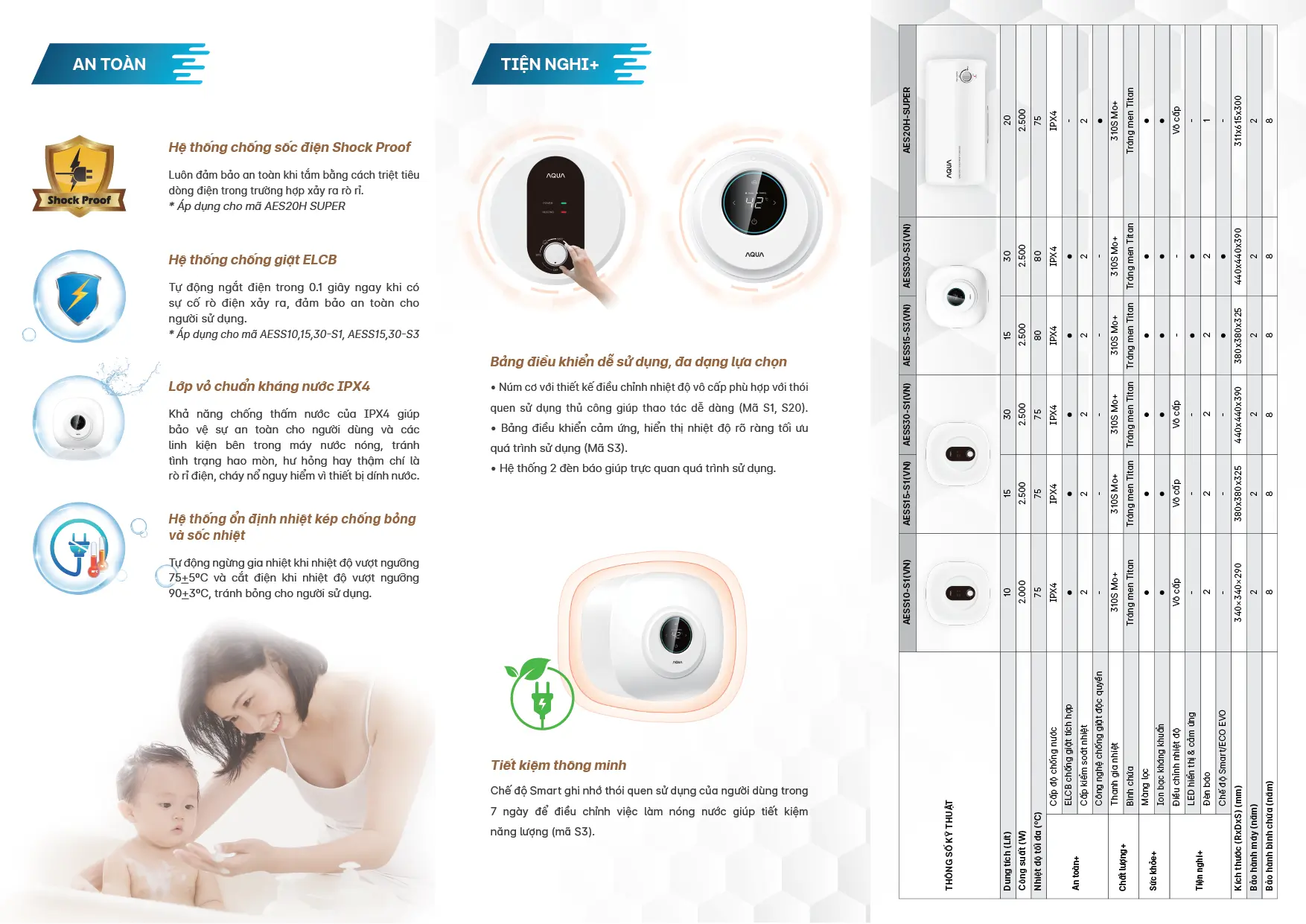 Bình nóng lạnh AQUA được thiết kế với phong cách hiện đại, tinh tế, dễ dàng hòa hợp với mọi không gian phòng tắm. Màu trắng chủ đạo cùng các đường nét mềm mại mang đến vẻ đẹp thanh lịch và sang trọng cho sản phẩm.