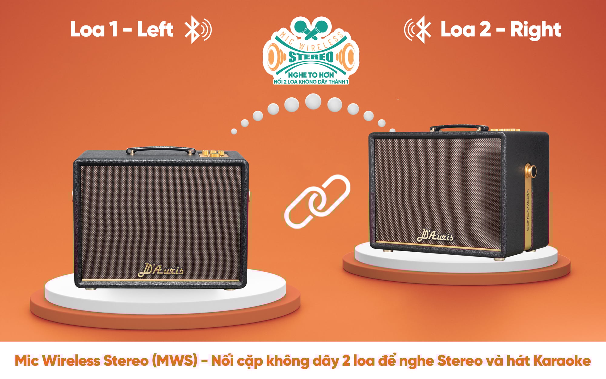 - Công nghệ của Soncamedia sử dụng tính năng MIC WIRELESS STEREO (MWS) cho phép kết nối 2 loa và mỗi loa phát tín hiệu riêng biệt của kênh bên trái và kênh bên phải.