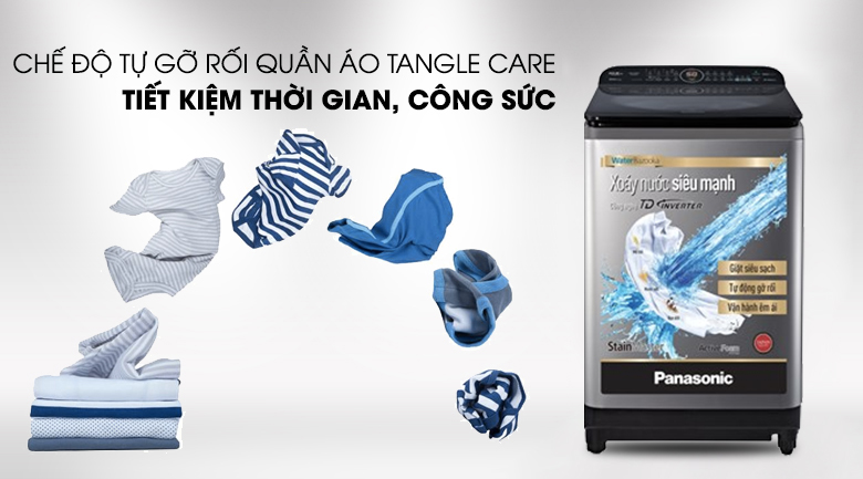 Chế độ Tangle Care được trang bị trên máy giặt cửa trên Panasonic này giúp tự động gỡ rối quần áo sau mỗi mẻ giặt vô cùng tiện lợi.