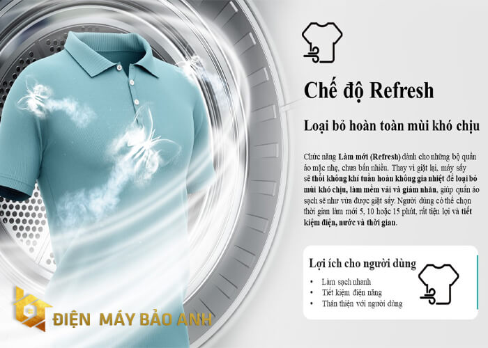 – Chế độ Refresh loại bỏ hoàn toàn mùi hôi khó chịu, dành cho những bộ quần áo mặc nhẹ. Thay vì giặt lại, máy sấy sẽ thổi luồng khí tuần hoàn không gia nhiệt để loại bỏ mùi, làm mềm vải và giảm nhăn.